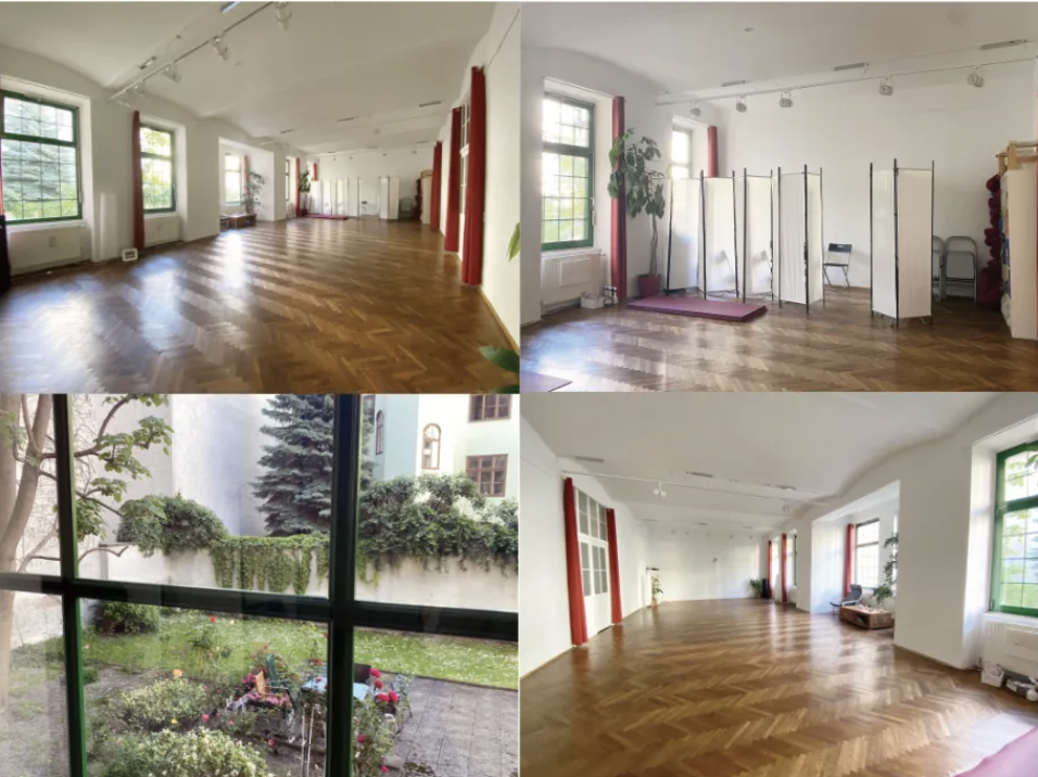 Studio 1 (82,5 m²) – ein heller, ruhiger Seminarraum mit breiter Fensterfront zum Garten, ideal für Unterricht und Ensemblespiel.